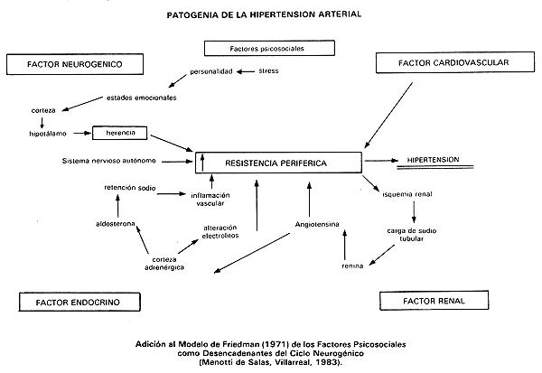 Nuestros hallazgos contrastados con las investigaciones reseñadas al comienzo de este trabajo permitirían adicionar al modelo de Friedman (1971, en Surwit y Cols., 1982), sobre el desarrollo de la hipertensión arterial esencial, los factores psicosociales como un factor más que a través del estilo de personalidad y la reactividad particular al stress índice directamente sobre los estados emocionales que inician en ciclo neurogénico.