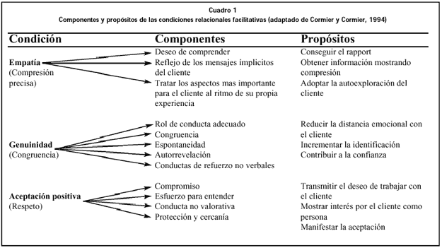 Cuadro 1. Componentes y propósitos de las condiciones relacionales facilitativas ( adaptado de Cormier y Cormier, 1994).